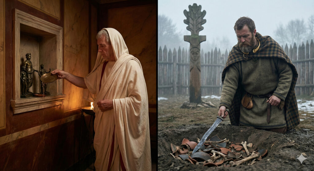 Le sacré domestique : Dans la maison, le culte est central. On honore les Lares (protecteurs du foyer), les Pénates (garde-manger), les Manes (les morts collectifs de la famille) et le Genius du paterfamilias. Le lararium (autel domestique) structure une piété quotidienne faite de gestes simples (offrandes de nourriture, entretien du feu).