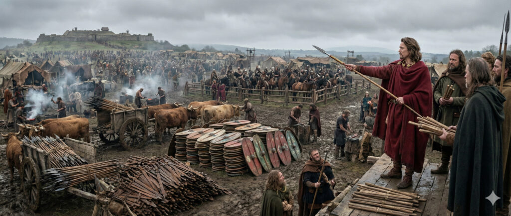 Fort de cette escorte, il reprend Gergovie par la force et un renversement politique armé, évinçant à son tour les partisans du compromis. Proclamé Rex — un titre de commandement suprême plutôt que de royauté héréditaire — il déploie une logistique d’une efficacité redoutable. Il coordonne une vaste confédération gauloise avec les Sénons, les Parisii, les Pictons, les Cadurques, les Turons, les Aulerques, les Lémovices, les Andes, et tous les peuples au bord de l’Océan, imposant à chaque cité des quotas d’otages et de production : ici, des épées, là, des fers de lance, des armes blanches, des pointes de javelot, des boucliers renforcés. Son obsession reste la cavalerie, l’élite de la guerre celtique, dont il exige le renforcement immédiat. Vercingétorix exige des délais extrêmement courts pour livrer armes et cavaliers. Pour cimenter cette coalition encore fragile, il use d’une justice martiale totalement impitoyable : les traîtres périssent dans les flammes des bûchers, tandis que les récalcitrants sont renvoyés chez eux les oreilles tranchées ou un œil crevé — stigmates indélébiles destinés à rappeler, dans chaque village de Gaule, que l’heure n’est plus à la discorde, mais à la survie collective face à l’ombre grandissante des aigles de César.