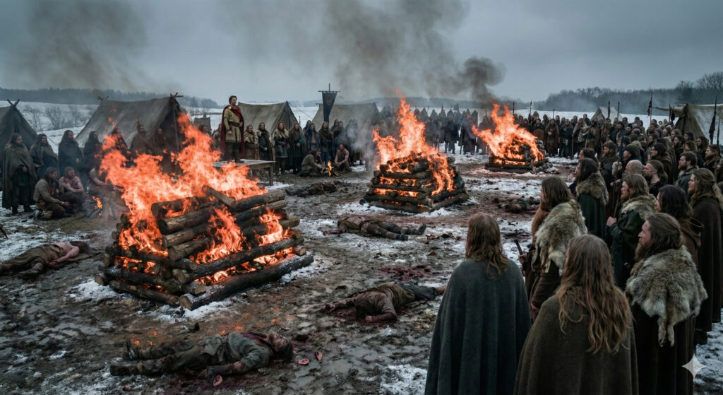 Le massacre est fulgurant. Les negotiatores romains, surpris dans leur sommeil ou tentant de saisir leurs glaives gladius hispaniensis , sont passés par le fil de l’épée. Parmi eux tombe Gaius Fufius Cita, un chevalier romain de haut rang. Ce n’est pas un simple commerçant : en tant que responsable de l’annone, il gérait les flux de blé indispensables au ravitaillement des légions. Son exécution est un acte de guerre logistique. Le port est mis à sac, les réserves de grains confisquées, et les biens des citoyens romains dispersés comme butin sacré.